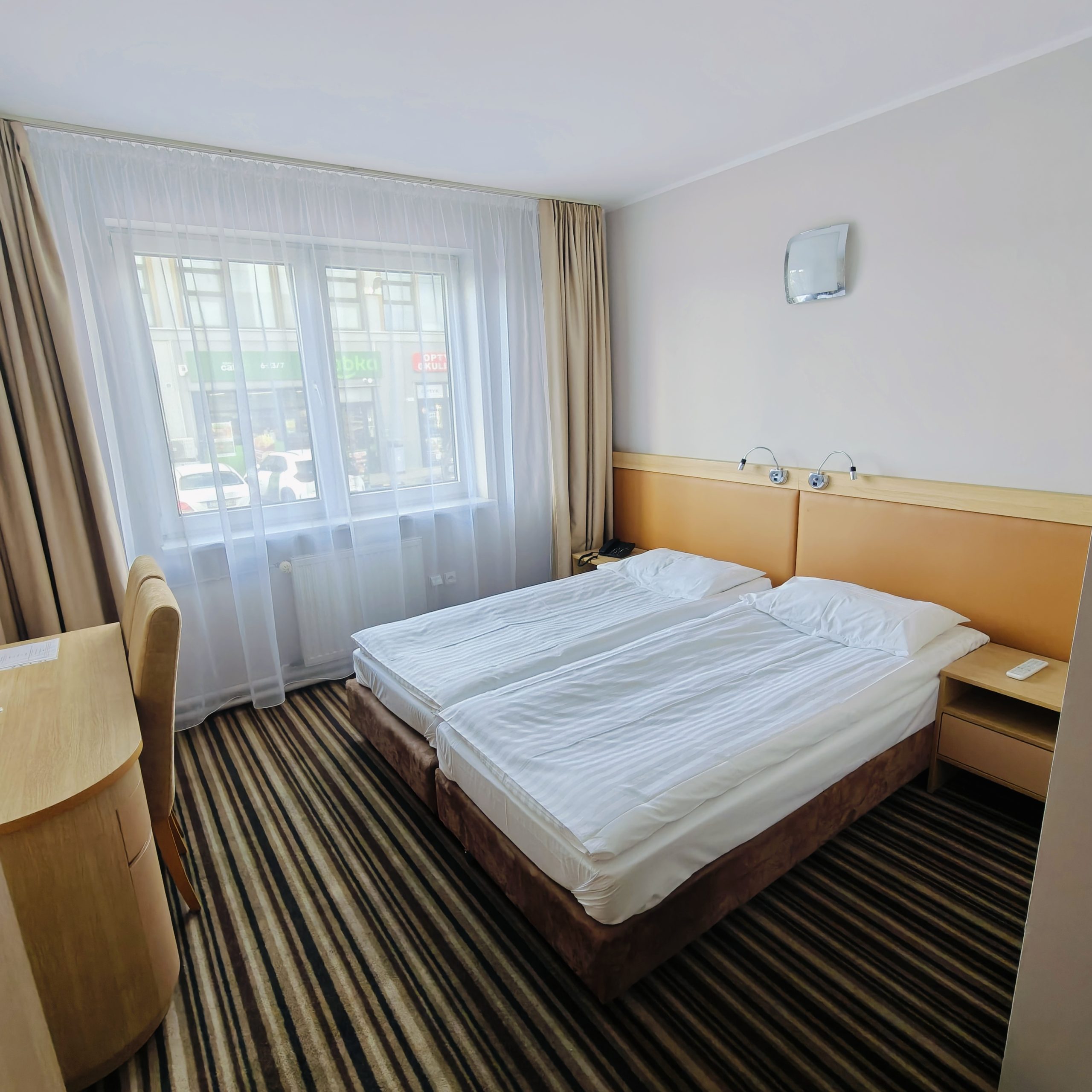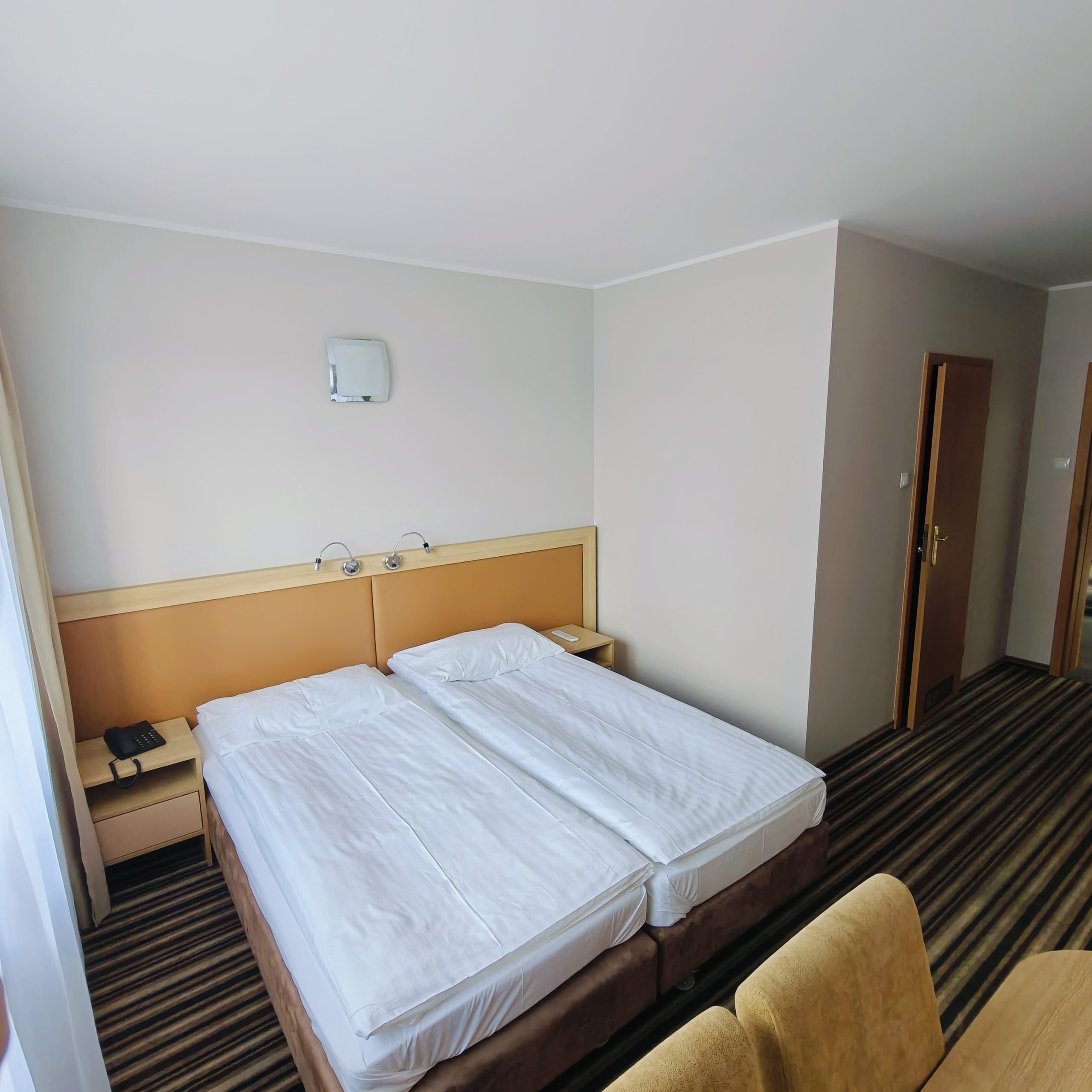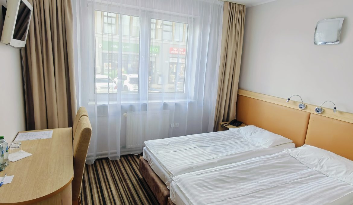 Komfortowy pokój dwuosobowy to doskonała przestrzeń do wypoczynku dla pary lub dwóch osób podróżujących razem. Wyposażony w duże, wygodne łóżko (lub dwa osobne), nowoczesną łazienkę z prysznicem, funkcjonalne biurko oraz szybkie Wi-Fi, zapewnia wygodę zarówno do relaksu, jak i pracy. Przytulne, eleganckie wnętrze, klimatyzacja, telewizor oraz zestaw do parzenia kawy i herbaty sprawiają, że pobyt staje się jeszcze bardziej komfortowy i przyjemny.